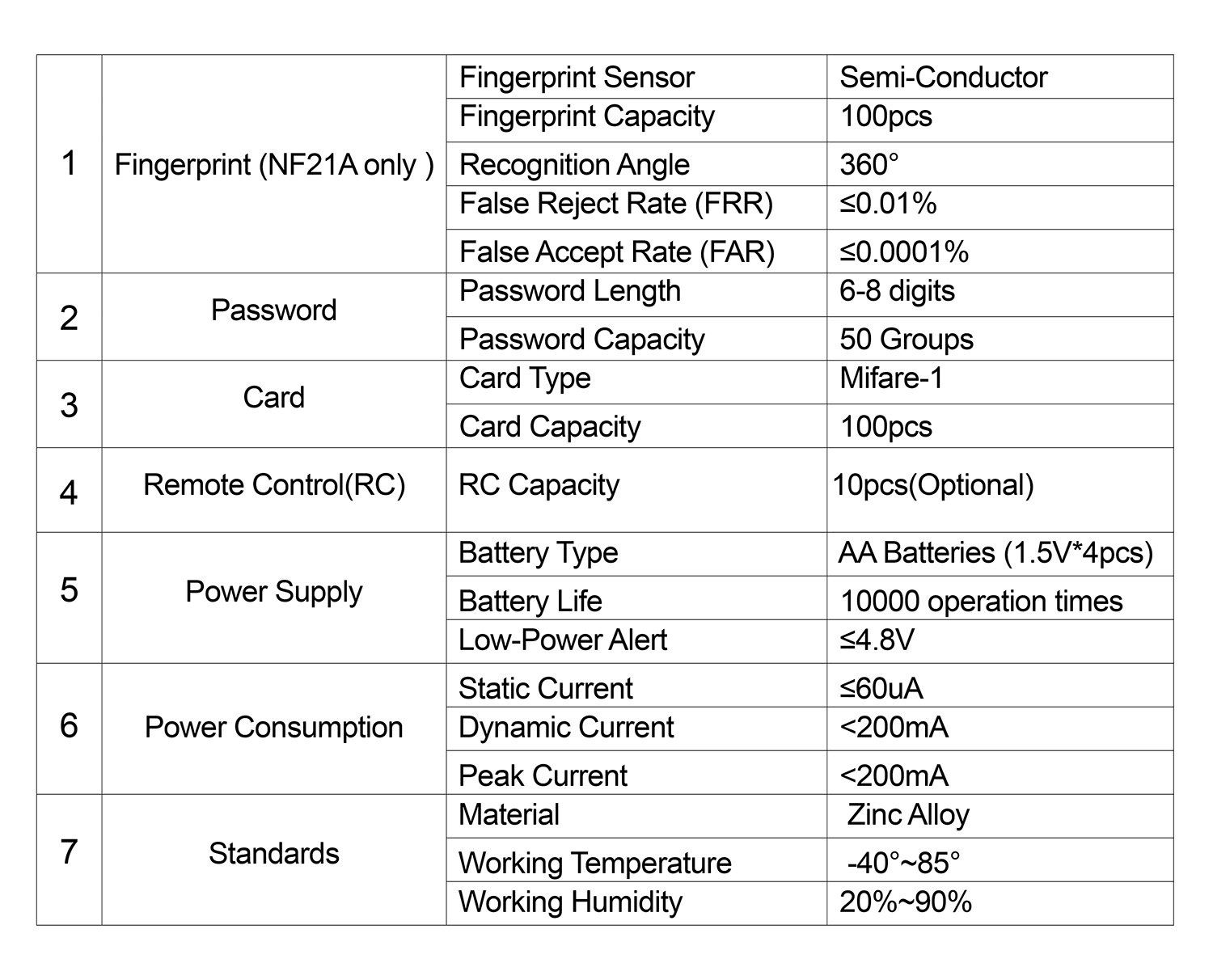 - 5 ways to unlock: Fingerprint , Password, Card (Mifare-1), Mechanical keys and Remote control